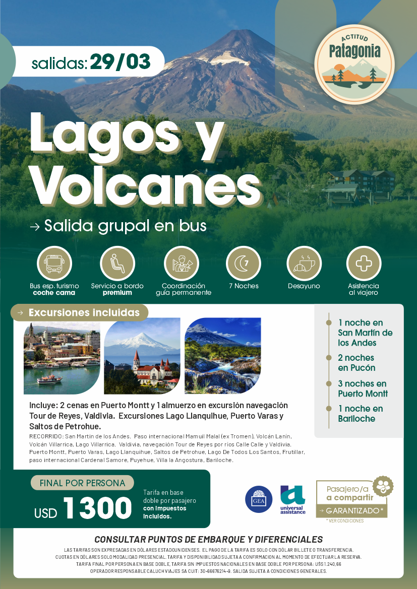 Recorrido: San Martin de los Andes. Paso internacional Mamuil Malal (ex Tromen), Volcán Lanín, Volcán Villarrica, Lago Villarrica. Valdivia, navegación Tour de Reyes por ríos Calle Calle y Valdivia. Puerto Montt, Puerto Varas, Lago Llanquihue, Saltos de Petrohue, Lago De Todos Los Santos, Frutillar, paso internacional Cardenal Samore, Puyehue, Villa la Angostura, Bariloche.