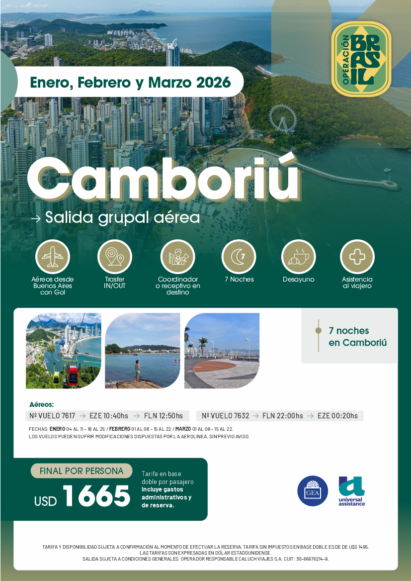 • Las tarifas expresadas son sujetas a modificaciones sin previo aviso hasta el momento de la reserva efectiva. El pago de la seña 30% reserva lugares, la tarifa solo es garantizada e inamovible al momento del pago del 100% de la misma.